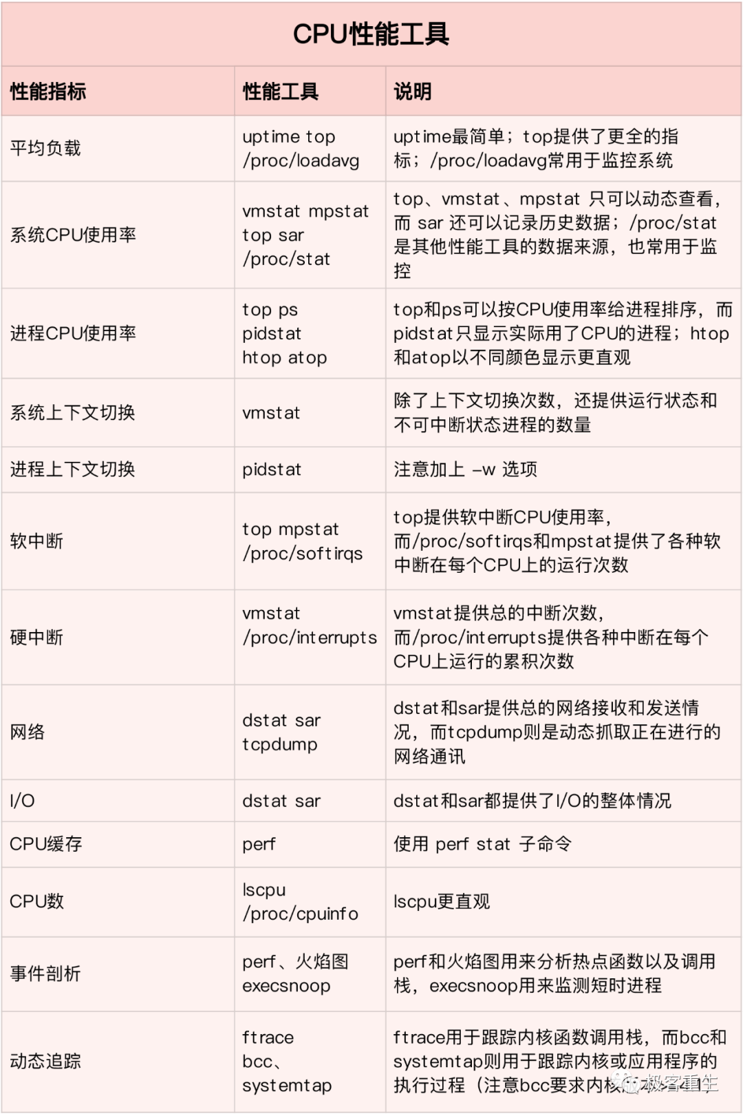 首先,从 CPU 的角度来说,主要的性能指标就是 CPU 的使用率、上下文切换以及 CPU Cache 的命中率等。下面这张图就列出了常见的 CPU 性能指标。