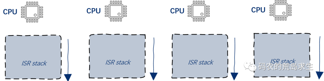 中断处理函数有自己特定的栈,被称之为ISR栈,ISR是interrupt service routine的简写,即中断处理函数栈。由于处理中断的是CPU,因此在这种方案下每个CPU都有一个自己的中断处理栈。