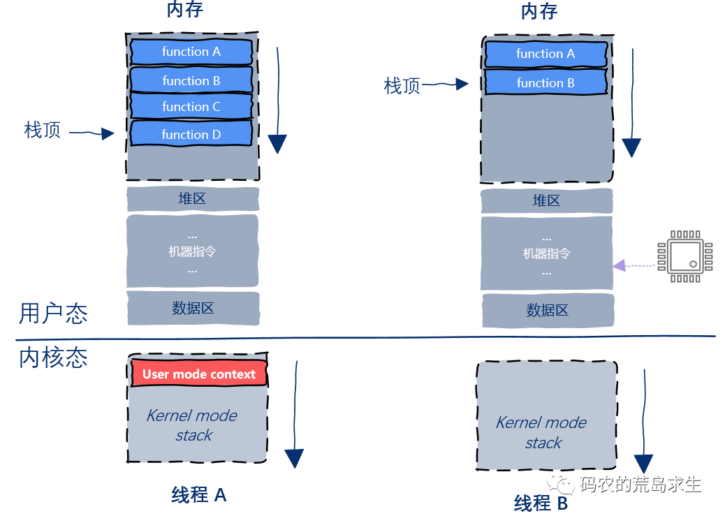 此后的故事和系统调用类似,CPU从用户态切换为内核态,并找到该用户态线程对应的内核线程,并将用户态线程的执行上下文信息保存在内核栈中: