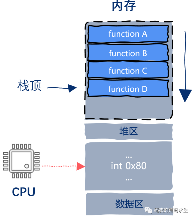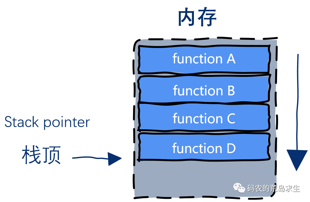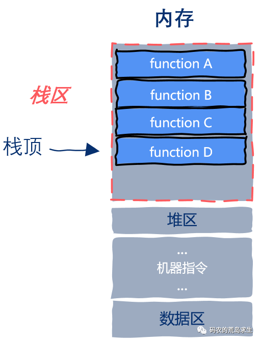 当然限于篇幅,这里关于函数运行时栈的讲解非常简略,关于这一部分更加详细的讲解关注公众号码农的荒岛求生并回复关键词运行时栈即可。