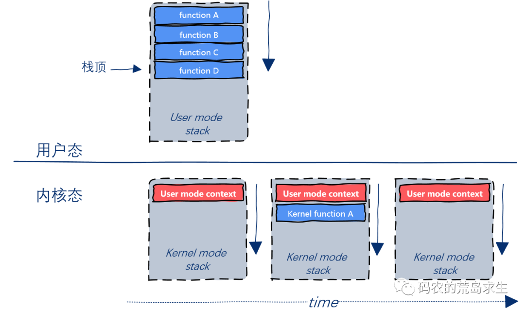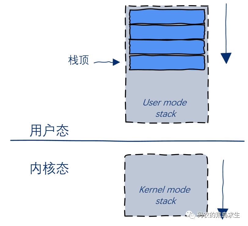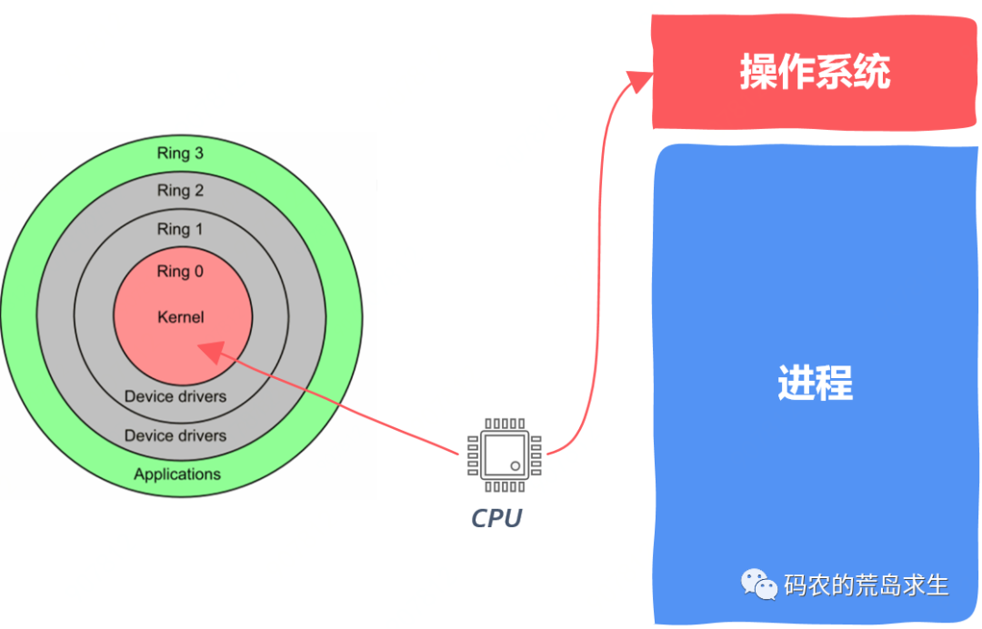 而在内核态下,CPU可以执行任意的特权指令,内核就工作在内核态,因此内核可以掌控一切。关于用户态内核态完整的阐述参见博主深入理解操作系统第2章,关注公众号码农的荒岛求生并回复操作系统即可。
