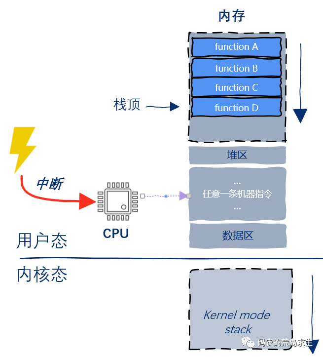 现在我们已经讲解了两种涉及CPU上下文切换的场景,包括函数调用以及系统调用,接下来我们再看一种,中断处理。