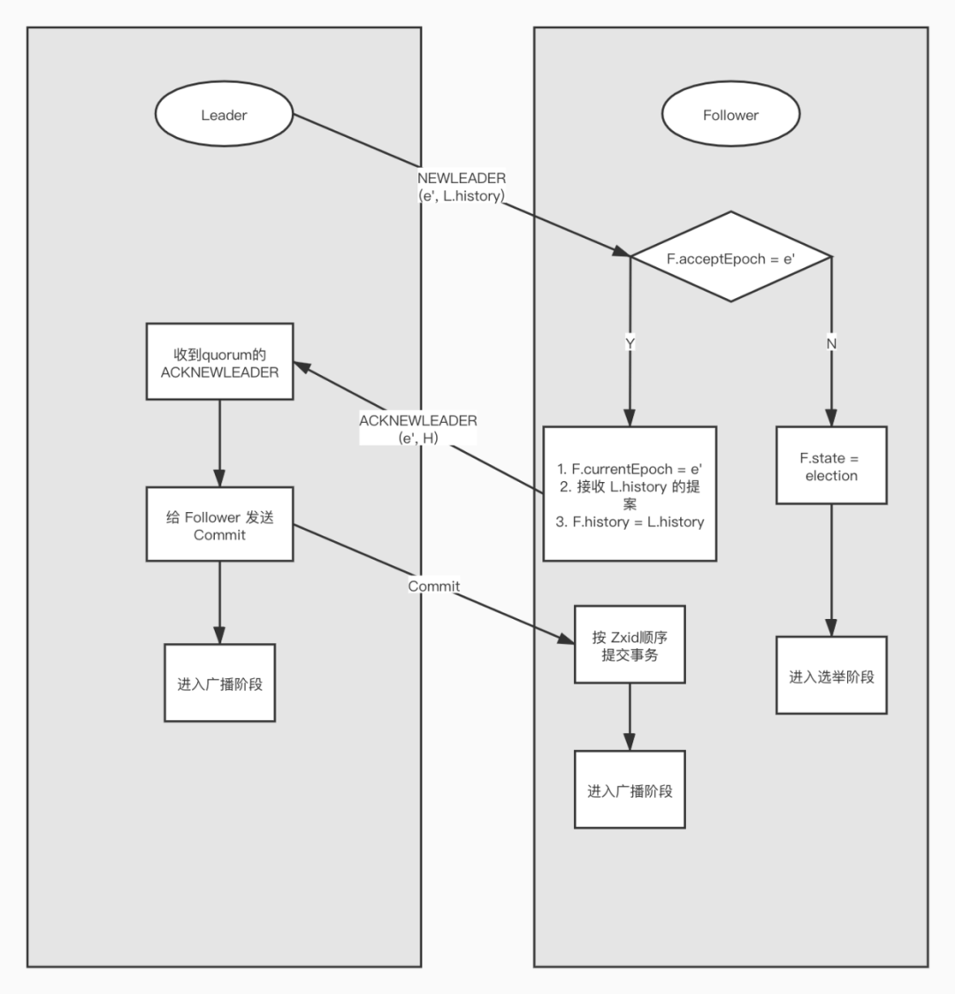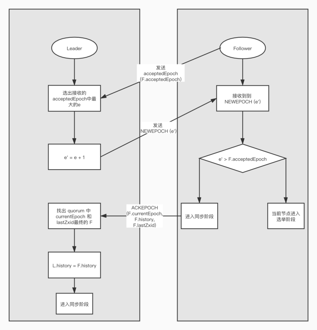 在这个阶段中,Followers和上一轮选举出的准Leader进行通信,同步Followers最近接受的事务Proposal。这个阶段主要目的是发现当前大多数节点接受的最新提议,并且准Leader生成新的epoch,让Followers接受,更新它们的acceptedEpoch。