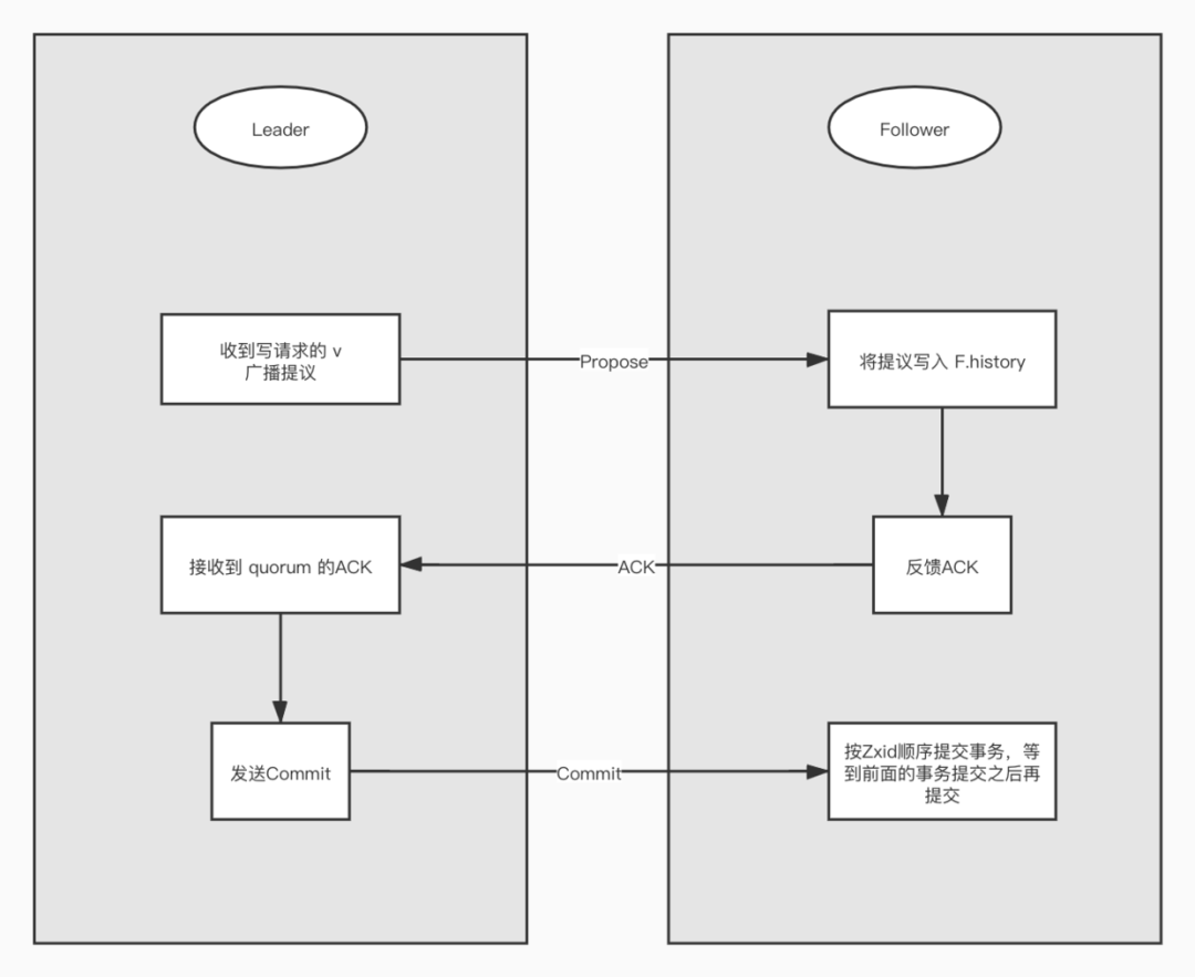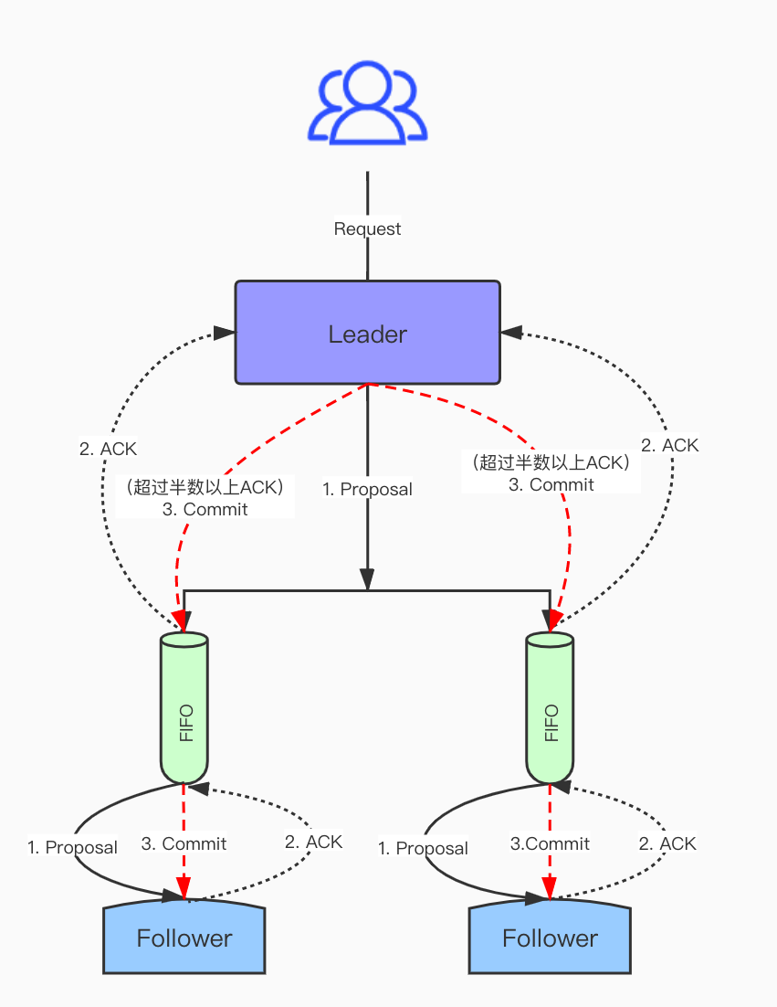 Leader服务器等待所有Follower服务器的反馈,一旦超过半数的Follower服务器进行了正确的反馈后,Leader就会向所有的Follower服务器发送Commit消息,要求将前一个Proposal进行提交。