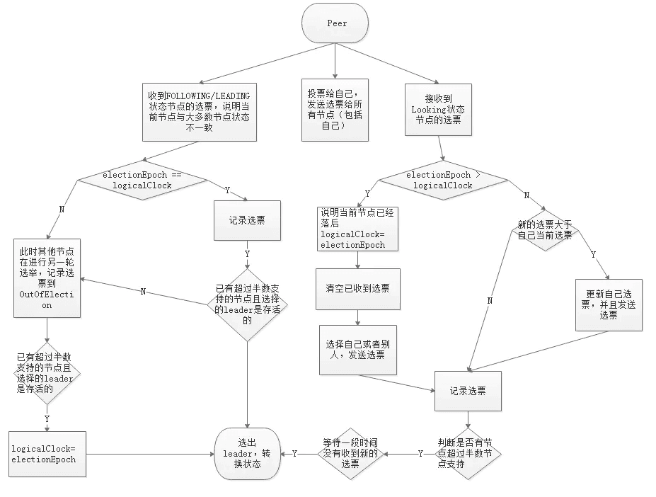 节点在选举开始时,都默认投票给自己,当接收其他节点的选票时,会根据上面的 Leader条件 判断并且更改自己的选票,然后重新发送选票给其他节点。当有一个节点的得票超过半数,该节点会设置自己的状态为 Leading ,其他节点会设置自己的状态为 Following。