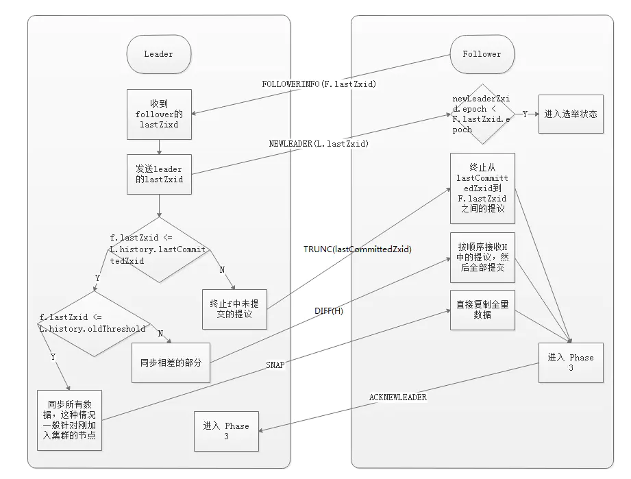 这一阶段 Follower 发送他们的 lastZxid 给 Leader,Leader 根据 lastZxid 决定如何同步数据。这里的实现跟前面的 阶段 3 有所不同:Follower 收到 TRUNC 指令会终止 L.lastCommitedZxid 之后的 Proposal ,收到 DIFF 指令会接收新的 Proposal。