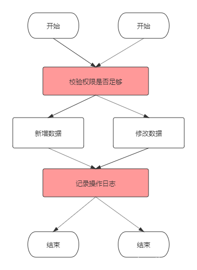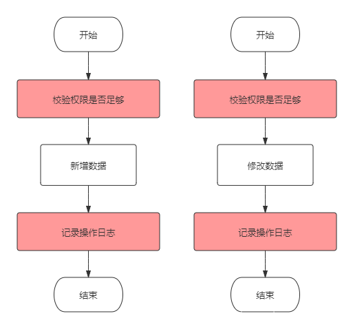 有多少业务操作,就要写多少重复的校验和日志记录代码,这显然是无法接受的。当然,用面向对象的思想,我们可以把这些重复的代码抽离出来,写成公共方法,就是下面这样: