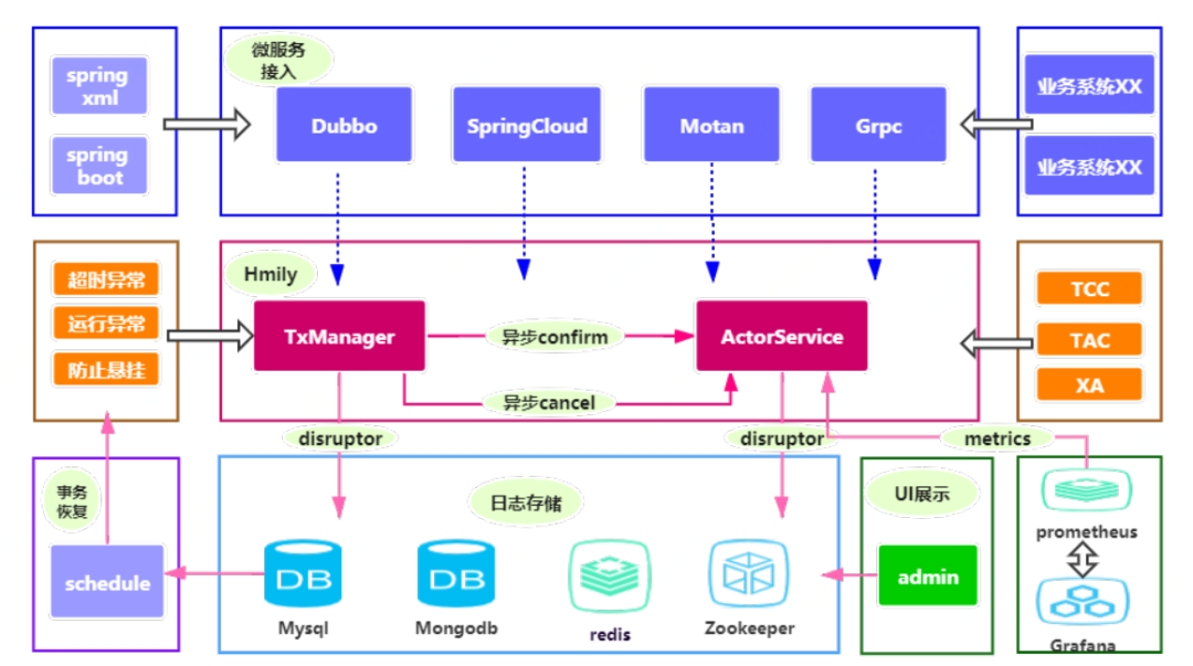 Hmily是一款高性能,高可靠,易使用的柔性分布式事务解决方案,目前提供了对dubbo,spring-cloud,motan,grpc等rpc框架的支持,在易用性上提供零侵入性式的 Spring-Boot, Spring-Namespace 快速集成,目标是打造金融级的一体系分布式事务解决方案。