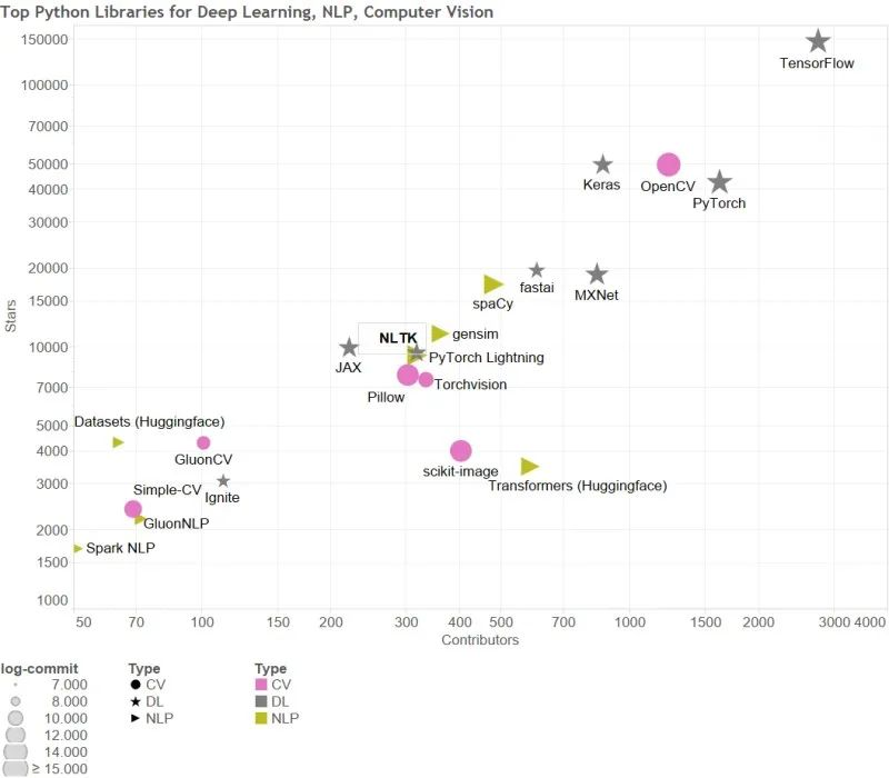 请注意,下面是由Gregory Piatetsky绘制的图示,并按类型标表示了每个库,按星标和贡献者对其进行绘制,它的符号大小则是以该库在Github上的提交次数的对数表示。