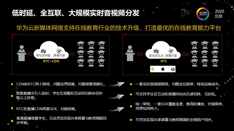 基于华为云的新媒体网络,我们支持在线教育技术升级,打造更优的在线教育平台。在传统架构下,实现低时延互动与大规模分发需要用到2个产品RTC 和CDN,这样存在4个问题:
