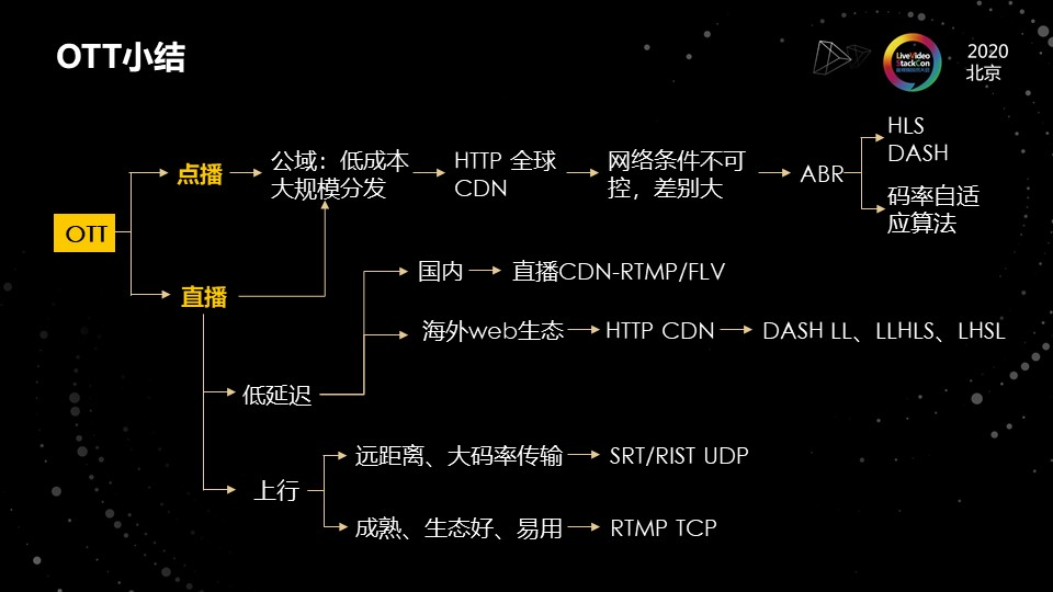 OTT个人直播体验,还有一个非常重要的点就是上行推流的稳定性,因为一旦推流质量不好,全网的观看质量都会下降。目前推流协议主要有三类:分别是RTMP、SRT和RIST,其中RTMP是主流,优势是:成熟、稳定、生态好,各类编码工具基本都支持。SRT和RIST是基于UDP传输,主要优势是:长距离传输(例如:跨洋)、大码率传输、弱网传输。另外相较于TCP层的拥塞算法优化,SRT和RIST可以在应用层优化传输算法,更新比较方便。一些大型跨洋直播的第一公里推流会使用这类协议。