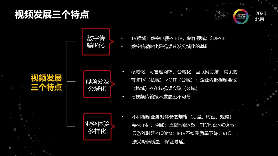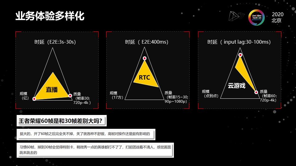 业务体验多样化:就是不同业务对体验的规格要求不同,主要存在三个方面:质量,规模,时延;如直播时延<5s;RTC时延<400ms;云游戏时延<100ms。