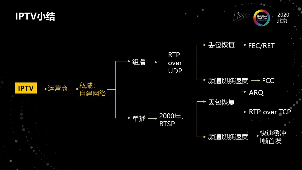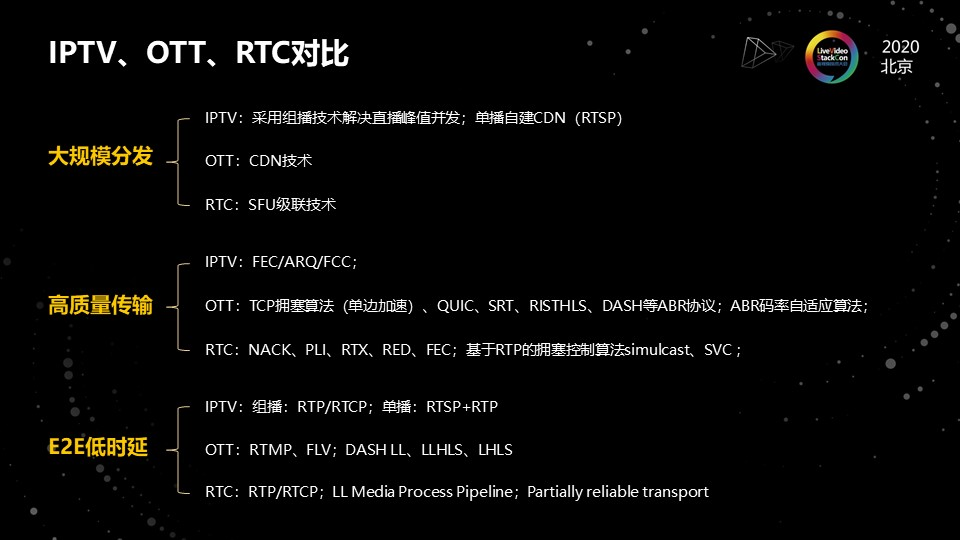 对不同应用场景下视频需求的理解,也能更好的帮助我们理解不同业务领域对技术的选型逻辑,能够让我们更快的发现当前技术的不足。接下来,会分别从IPTV、OTT、RTC业务的角度,梳理音视频传输技术选型背后的逻辑。
