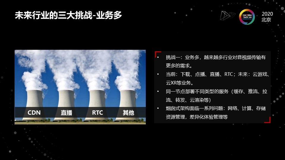 第一业务多。边缘业务类型越来越多,从现在已经成熟的下载、点播、直播、RTC,在到正在快速发展的云游戏、云XR等;同一节点部署不同类型的服务,包括缓存、推流、拉流、转发、云渲染等;而烟囱式架构面临一系列问题:包括网络、计算、存储资源管理、差异化体验管理等。