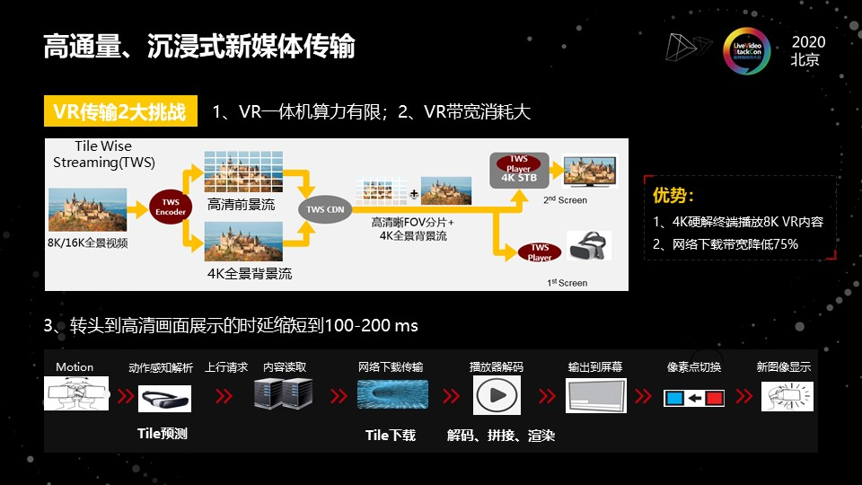 这个方案的优势是:4k硬解终端可以播放8K VR内容;网络下载带宽降低75%;我们通过端边云协同,实现了用户转头到高清画面展示的延迟只需要100-200ms,人眼几乎无法感知。