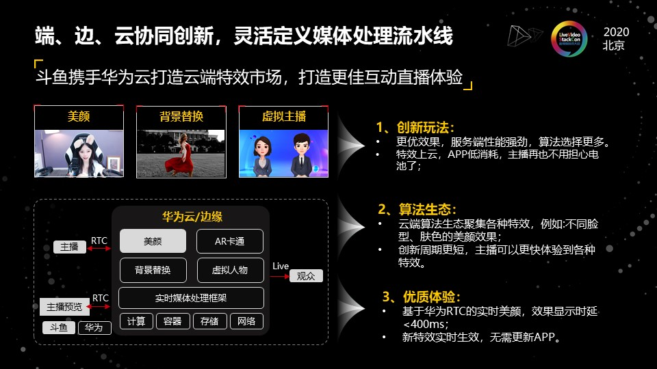 第二点形成算法生态:云端算法生态聚集各种特效,例如:不同脸型、肤色的美颜效果;创新周期更短,主播可以更快体验到各种特效。