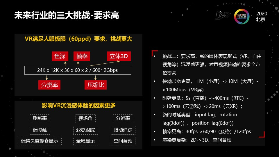 第二要求高。新的媒体表现形式沉浸感更强,对音视频传输的要求更高。而且这种提高是全方位的,主要包括: