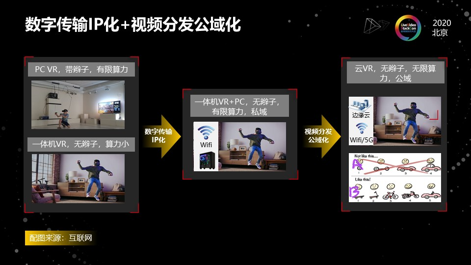 目前有一个一体机+PC的方案,既没有“辫子”,同时也可以使用PC的算力,即通过Wifi 将PC渲染出来的图像经过编码后传输到VR 头盔。相对于PC VR,它可以看成是数字传输的IP化。