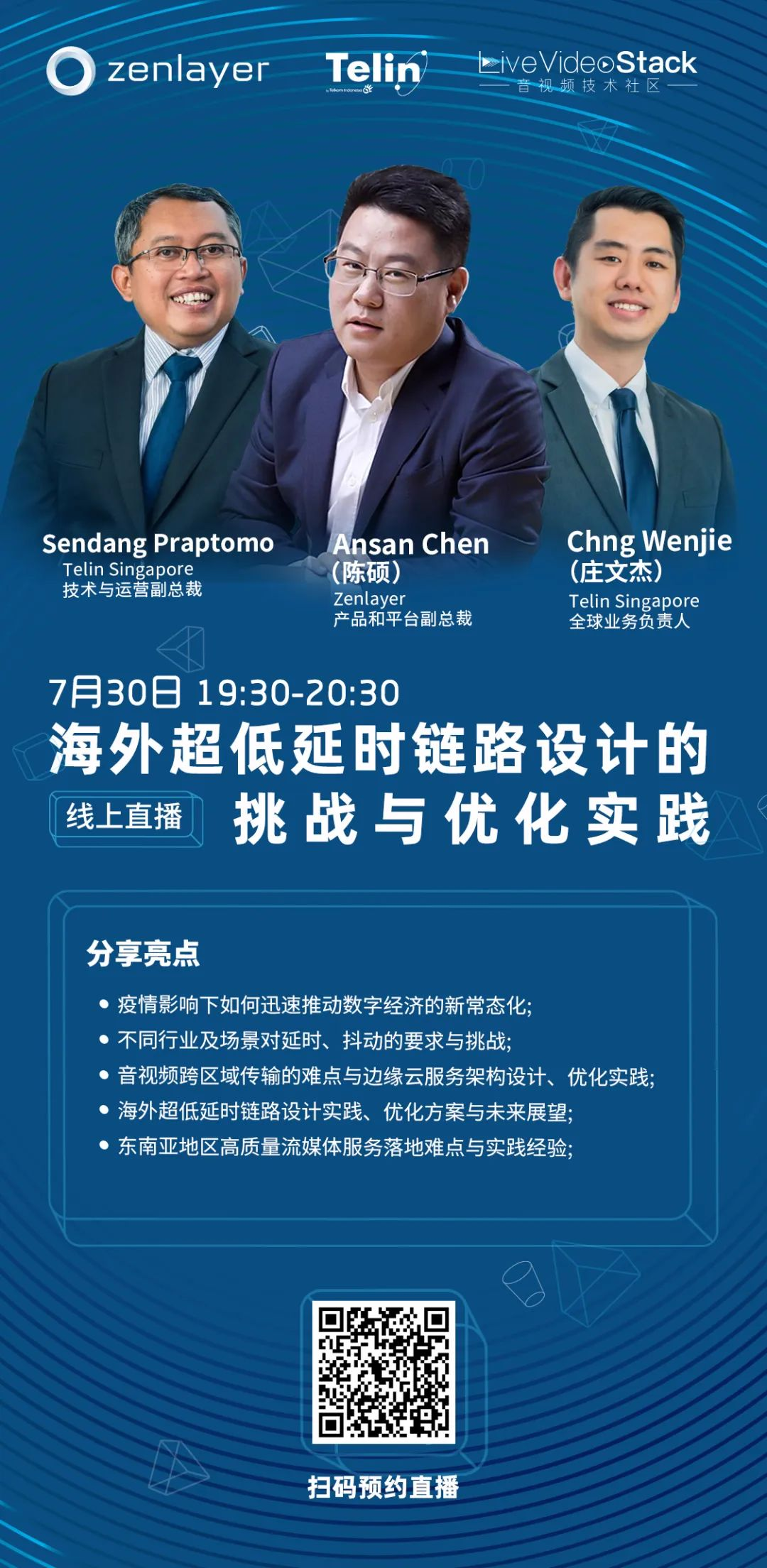 今晚19:30,我们邀请到全球边缘云服务商Zenlayer产品和平台副总裁陈硕,以及Telin Singapore全球业务负责人庄文杰、技术与运营副总裁Sendang,探索不同场景下延时要求、网络架构设计难点与挑战,重点解析海外超低延时链路设计的思路、优化与未来演进方向,并结合东南亚地区分享如何保障高质量流媒体服务的实践经验。