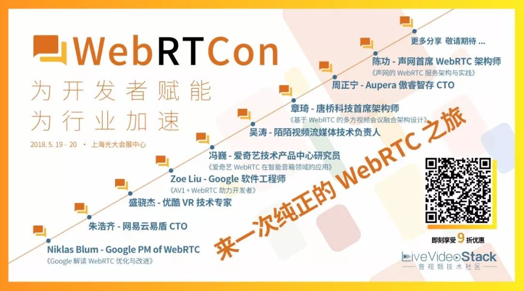 经历了起跑、 热炒、失落的7年长跑后,伴随1.0版定稿,获得iOS端支持,WebRTC具备了打通主流生态系统和端的能力,2018年也将是WebRTC落地的最好时机。由LiveVideoStack音视频技术社区出品,WebRTCon 2018将于5月在上海举行,这是一次对过去几年WebRTC技术实践与应用落地的总结。扫描下图二维码了解详情。