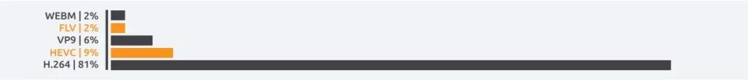 自endcoding.com成立以H.264每年同比增长。今年继续增长,反映其设备和浏览器支持无处不在。H.264是HLS和DASH的主流自适应比特率标准中最流行的编码。虽然fmp4 CMAF可能代表未来,但支持老设备(即Android 低于7.0,iOS 低于11,OSX 低于High sierra和Windows 10之前的版本 )的大多数发布商不可能放弃旧版HLS H.264,TS。