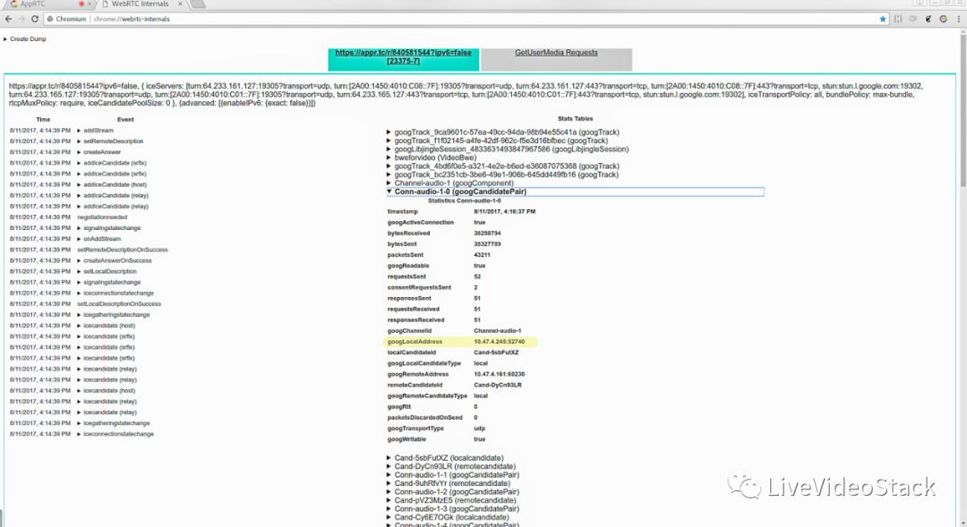 为了在我们的例子中找到本地地址,我们需要扩大conn-audio-1-0,并且注意googlocaladdress,其值为10.47.4.245:52740。
