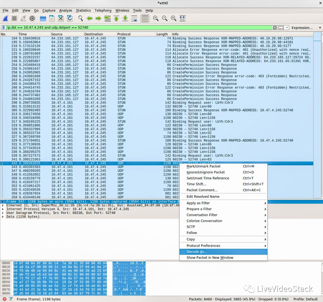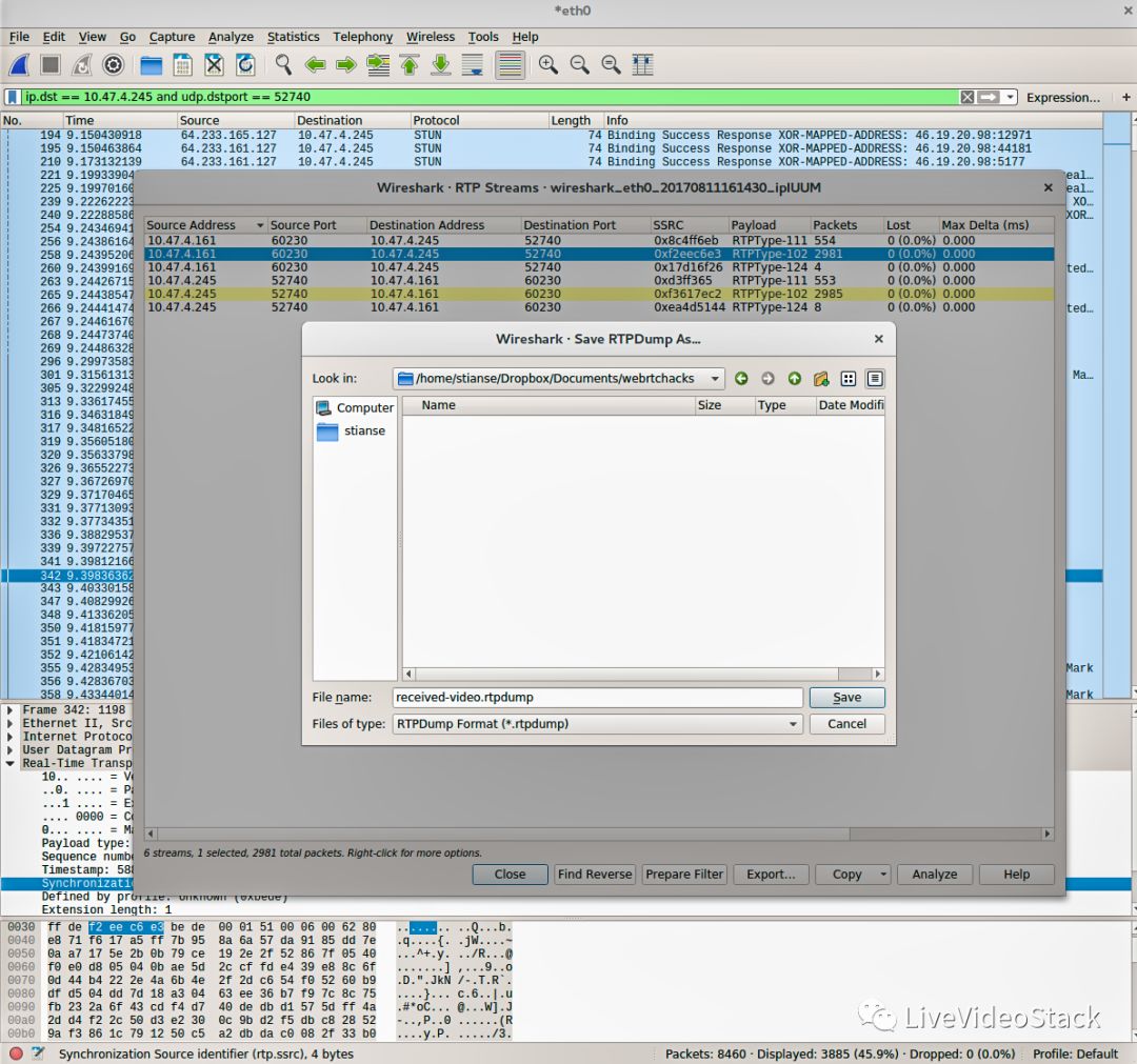 现在,为了在我们的呼叫中方便地识别和提取所接收的视频流,我们已经收集了所有必要的信息。Wireshark可能会将捕获的RTP数据包简单地以UDP数据包来显示。我们想告诉Wireshark这些是RTP包,所以我们可以将其导出为rtpdump格式。