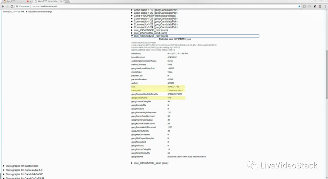 首先,扩大接收到的视频流的统计表,给一个类似于ssrc_4075734755_recv这样的命名。统计表可能不止一个,一般第二个是音频流,还可能有一对以_send为后缀的表,里面是发送流的等效统计信息。视频流接收的统计表可以根据_recv后缀和mediaType=video来识别出来。分别记下ssrc、googCodecName 和transportId属性,例如4075734755、VP9和channel-audio-1。