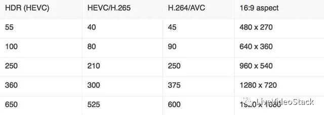 表3:苹果公司建议的H.264,HEVC和HDR的编码梯度