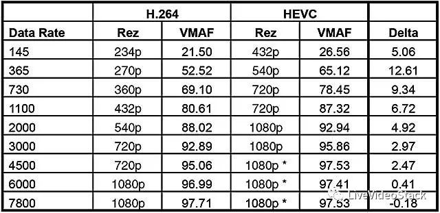 画质体验(Quality of Experience,QoE)提升:通过下表1可以看到,基于VMAF评测指标对比,VMAF得分相差无几的情况下,HEVC的码率比H.264减少50%左右。