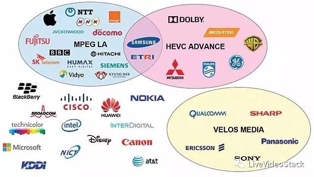 PPV和订阅服务的使用费:如果您正在分发订阅内容或PPV视频,您可能已经在MPEG LA H.264专利池中为H.264使用付了费。HEVC有三个专利池,分别是MPEG LA、HEVC Advance和Velos Media。 详情可见图1,这是Divideon公司的Jonatan Samuelsson2017年11月在Streaming Tech Sweden演示中的图片。