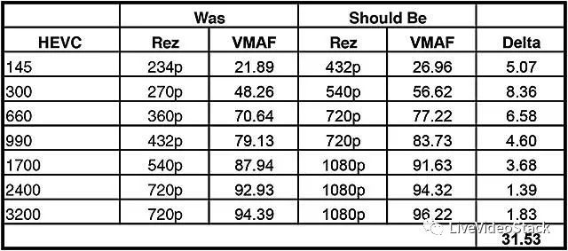 长话短说,文章提出HEVC的最佳梯度会去掉几个较低分辨率的梯级,并迫使较高分辨率梯级降低位置。表5左边显示了苹果公司建议的梯度,右边是一个更为优化的梯度(为动画电影“Sintel”定制),VMAF评分则评估两种选择的质量。如果您的目的是获得最佳的体验质量(QoE),那么使用Should Be梯度会比苹果公司指定的Was梯度获得更好的效果。
