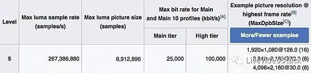 HEVC编码文件:HLS编写规范规定:“HEVC的Profile,Level和Tier必须小于或等于Main10的Profile,Level 5.0,High Tier。”表2显示了the Wikipedia HEVC页面 的级别和层级限制。 值得一提的是,虽然您可以以高达每秒128帧的帧速率对1080p视频进行编码,但4K分辨率却限制在30 fps或更低。 请注意,HLS编写规范禁止所有编解码器的帧频超过60 fps。