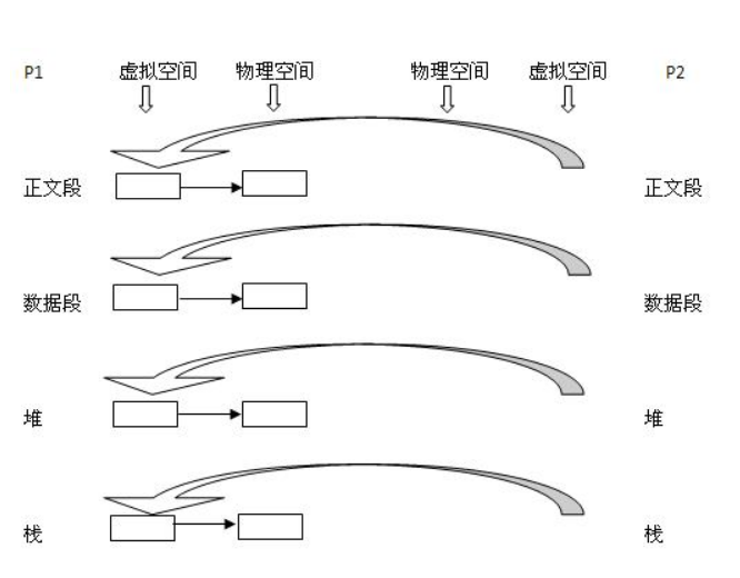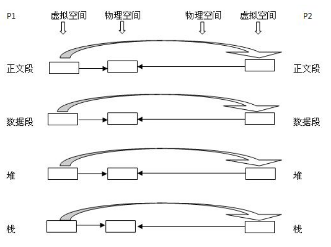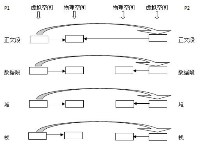 (2) 为这四个部分分配物理块,P2的:正文段->P1的正文段的物理块,其实就是不为P2分配正文段块,让P2的正文段指向P1的正文段块,数据段->P2自己的数据段块(为其分配对应的块),堆->P2自己的堆块,栈->P2自己的栈块。如下图所示:从左到右大的方向箭头表示复制内容。