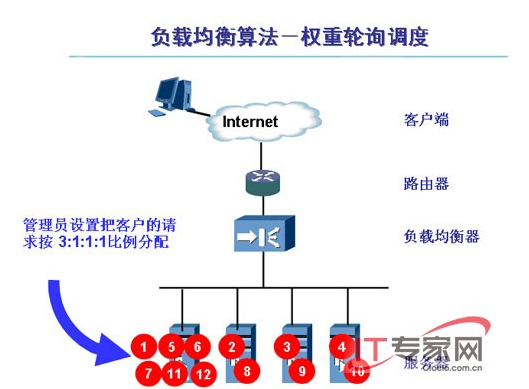 上面所讲的轮询调度算法并没有考虑每台服务器的处理能力,在实际情况中,可能并不是这种情况。由于每台服务器的配置、安装的业务应用等不同,其处理能力会不一样。所以,我们根据服务器的不同处理能力,给每个服务器分配不同的权值,使其能够接受相应权值数的服务请求。