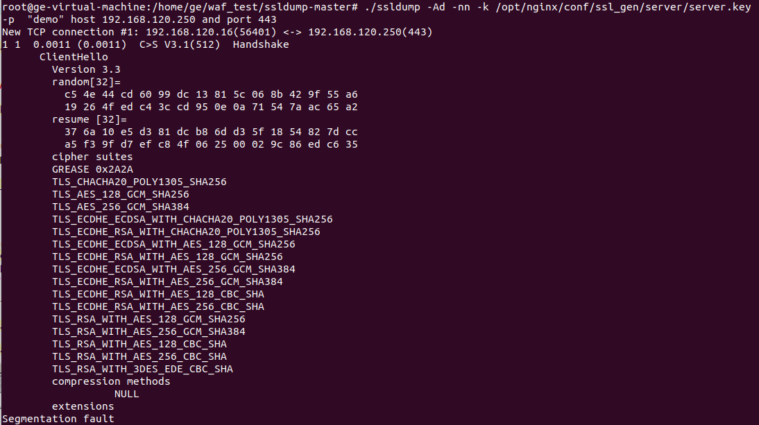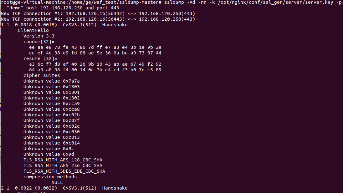 使用ssldump工具和服务端私钥解析https数据流,但是某些cipher类型并不能解析出application data,参考链接:https://support.f5.com/csp/article/K10209#3