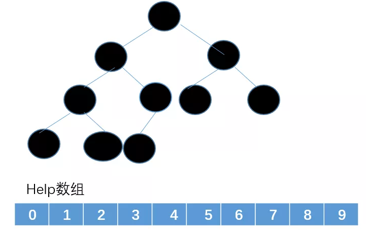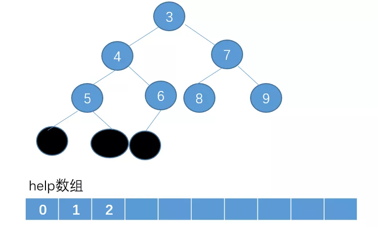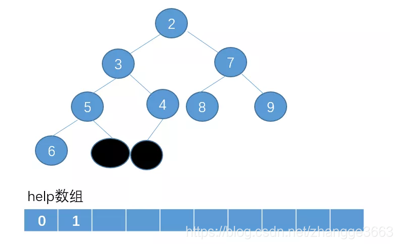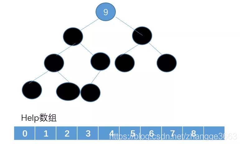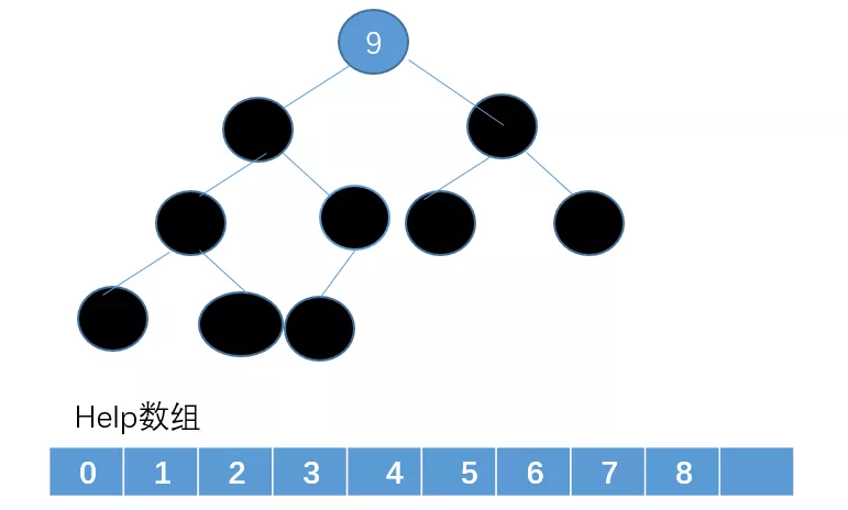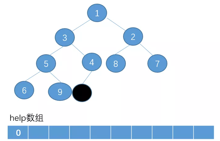我们把堆顶这个节点删除,然后把删除的节点放在一个辅助数组help里(黑色的节点表示已经被删除没用的点)。