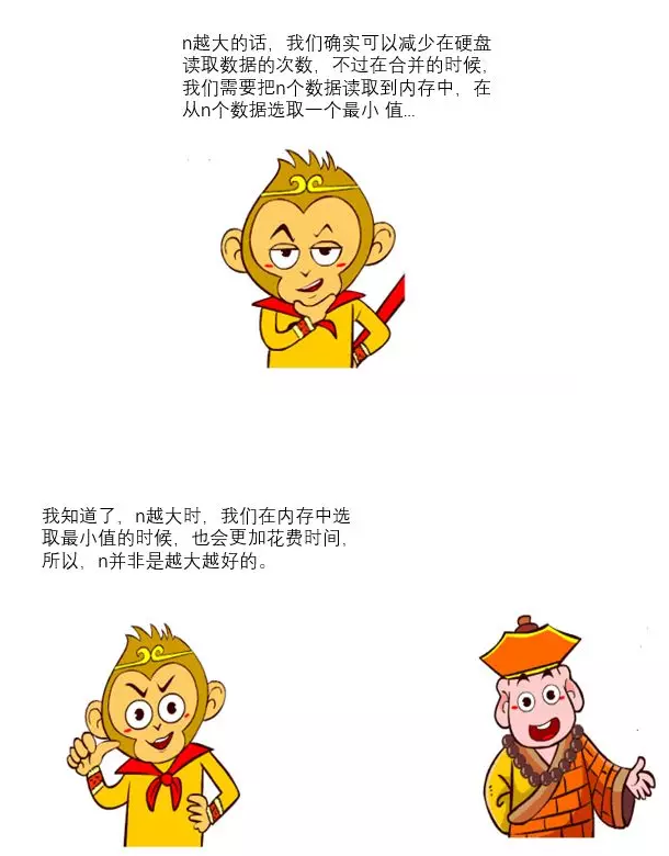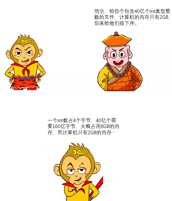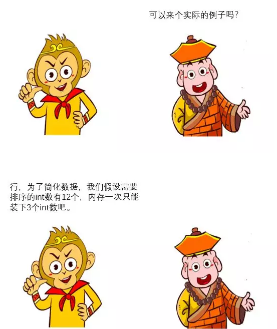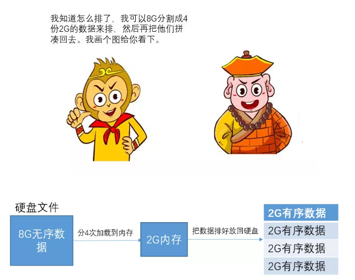 这种方法适合要排序的数据太多,以至于内存一次性装载不下。只能通过把数据分几次的方式来排序,我们也把这种方法称之为外部排序。