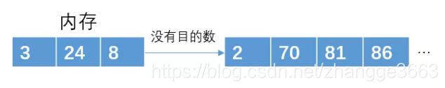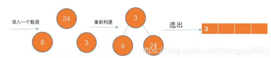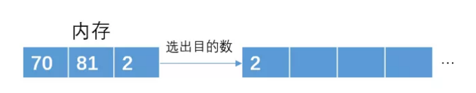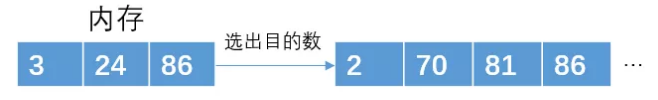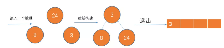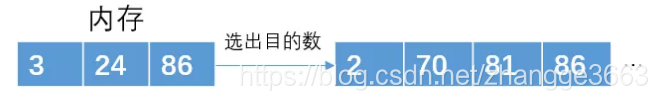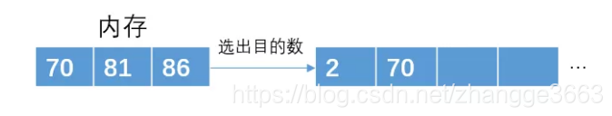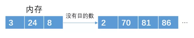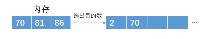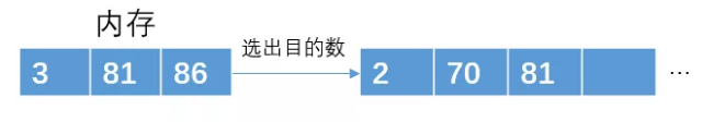 这样一直重复,直到内存中的树都比p1中的数小,这时p1子串存放结束,继续来p2子串的存放。例如(这时假设内存只能存放3个int型数据);