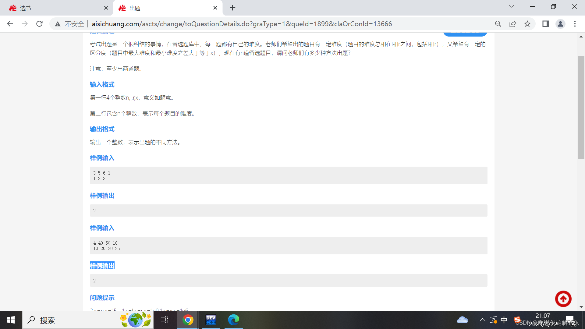 int main(){int n,l,r,x;int zd,zx=0,s=0,cnt;cin>>n>>l>>r>>x;for(int i=0;i>a[i];zd=1e9;for(int i=0;i<(1<0){s=s+a[j];zd=max(zd,a[j]);zx=min(zx,a[j]);cnt++;}}if(cnt>=2&&zd-zx>=x&&l<=s&&s<=r) ans++;}cout<