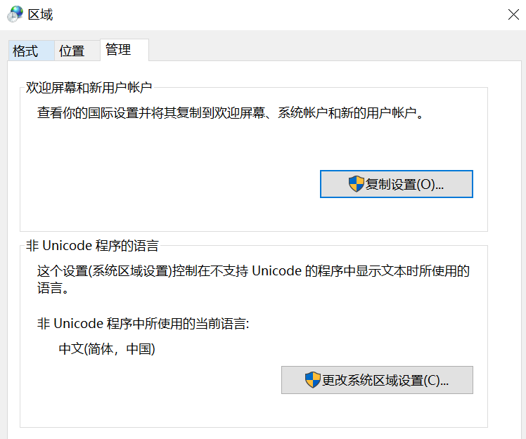 在最右边的“设置”选项下,有一个“非Unicode程序的语言”,将它改为中文(简体,中国)就OK啦。