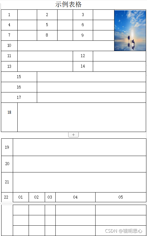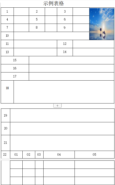 public static HashMap tableTQDocx(XWPFDocument doc) {//处理word表格内容Iterator it = doc.getTablesIterator();// 过滤前面不需要的表格// if (it.hasNext()) {// it.next();// }// 得到需要的第二个表格,业务数据HashMap map = new HashMap();while (it.hasNext()){XWPFTable xwpfTable = it.next();// 读取每一行for (int i = 0; i < xwpfTable.getRows().size(); i++) {XWPFTableRow row = xwpfTable.getRow(i);if (row != null) {//根据模板读取需要的数据单元格,从第二列开始读取for (int j = 0; j < row.getTableCells().size(); j++) {XWPFTableCell cell = row.getCell(j);XWPFTableCell cell2 = row.getCell(j + 1);if (cell != null && cell2 != null) {String cellText = cell.getText();String cellText2 = cell2.getText();//这里对于22部分的表格进行单独处理if(cellText.equals("22")){ArrayList> list = new ArrayList>();while (true){i++;XWPFTableRow row2 = xwpfTable.getRow(i);String cellText8 = row2.getCell(0).getText();//这里判断:如果获取到的内容等于23部分,说明22部分内容已经获取完毕,关闭当前循环if(cellText8.equals("23")){i--;break;}//22部分每行五个,直接获取五个,开启下一行String cellText3 = row2.getCell(1).getText();String cellText4 = row2.getCell(2).getText();String cellText5 = row2.getCell(3).getText();String cellText6 = row2.getCell(4).getText();String cellText7 = row2.getCell(5).getText();ArrayList List2 = new ArrayList();List2.add(cellText3);List2.add(cellText4);List2.add(cellText5);List2.add(cellText6);List2.add(cellText7);list.add(List2);}map.put("22",list);break;}if(cellText.equals("1")){if(map.get("1") == null){map.put("1",cellText2);}}if(cellText.equals("2")){map.put("2",cellText2);}if(cellText.contains("3")){map.put("3",cellText2);}//下同}j++;}}}}
