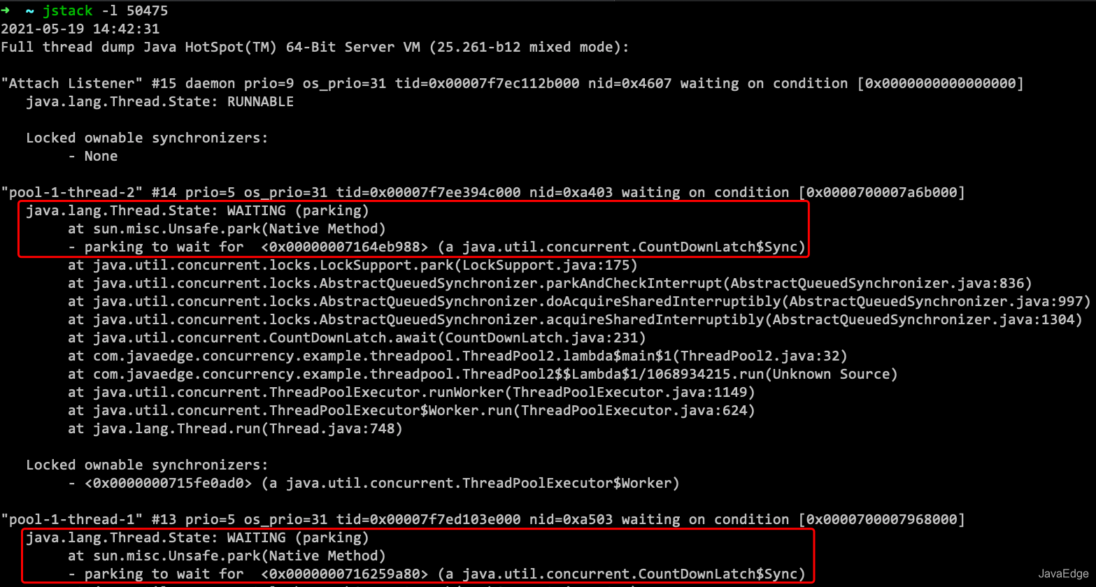 • 每个线程下面都会输出当前状态,以及这个线程当前持有锁以及等待锁,当持有与等待造成循环等待时,将导致死锁