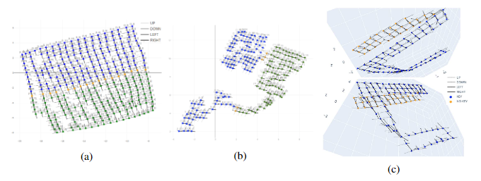 (a)、(b):绘制500个环境步骤后,从图7a和7b中学习到的开放和4室迷宫环境抽象表示的完整历史。颜色表示代理位于迷宫的哪一侧,显示网格坐标和过渡。(c) :300步后,我们的多步迷宫的两个相同的完整学习历史抽象三维表示视图。橙色和蓝色点分别表示没有键和有键的状态。我们的代理能够从两组状态之间的距离中分辨出代理拥有密钥的状态和没有密钥的状态。在抽象状态空间中,状态的相对位置也保持着关于agent位置的有意义信息。