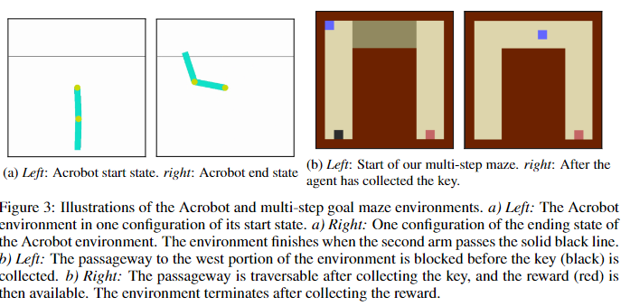 为了测试我们的方法在固定迷宫之外的有效性,我们在基于控制的环境Acrobot(Brockman et al.,2016)和多步迷宫环境中进行了实验。我们的方法(规划深度d=5)与不同原型的强勘探基线进行了比较: