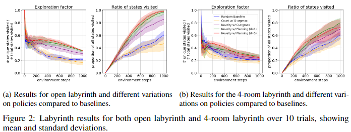 我们在4室迷宫域上进行了与开放迷宫相同的实验,结果如图2b所示。在这两种情况下,我们的方法都优于该领域的两个基线(随机和基于计数)。