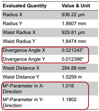 由于光束切趾,光束质量(M2)微量减小。由于激光光束具有发散性,M2在X和Y方向上有不同的减小量。