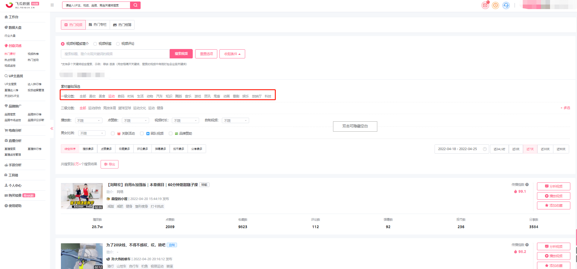例如如果是从事运动方面账号的用户,就可以选择“热门视频”的运动分类,筛选出对应热门视频数据,数据可支持导出。