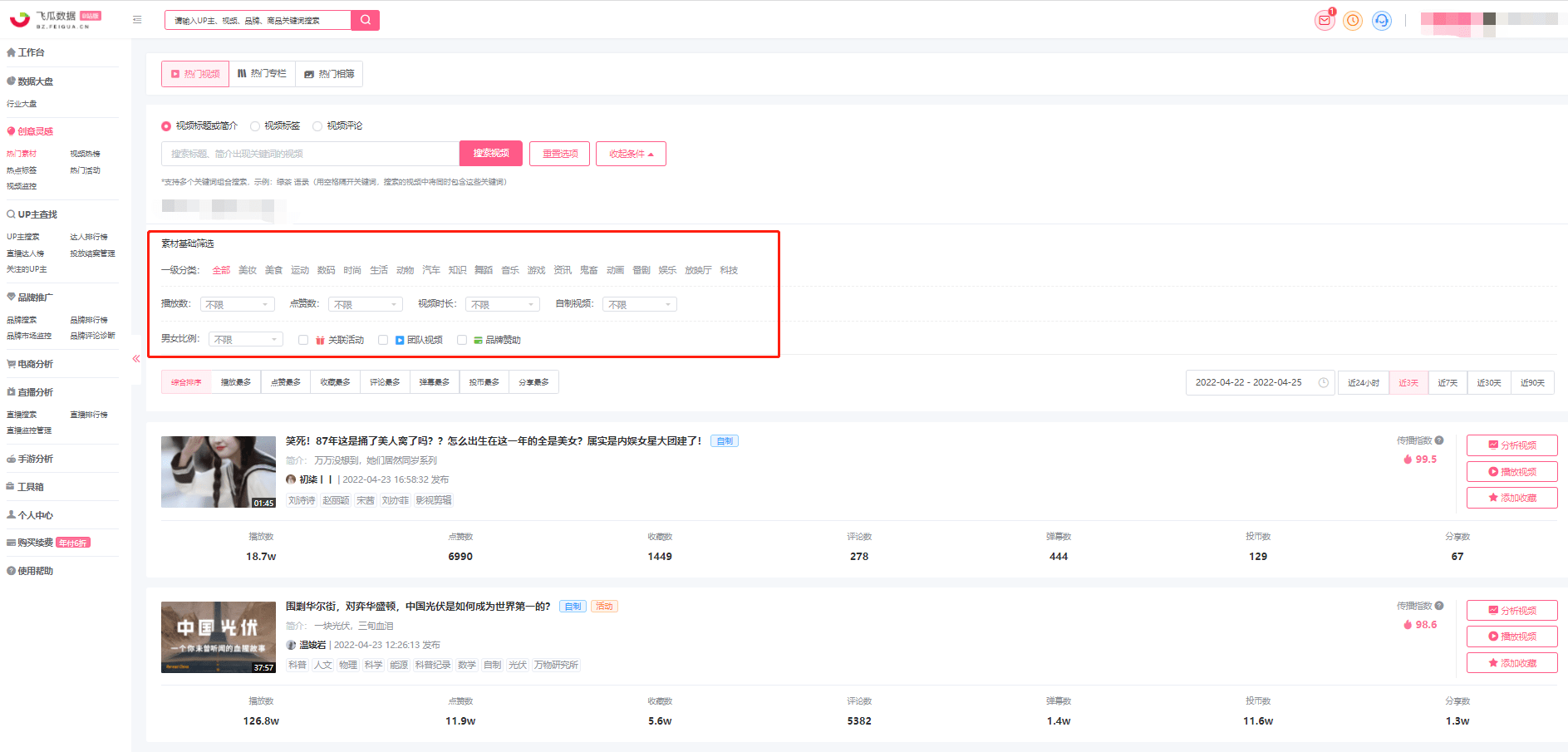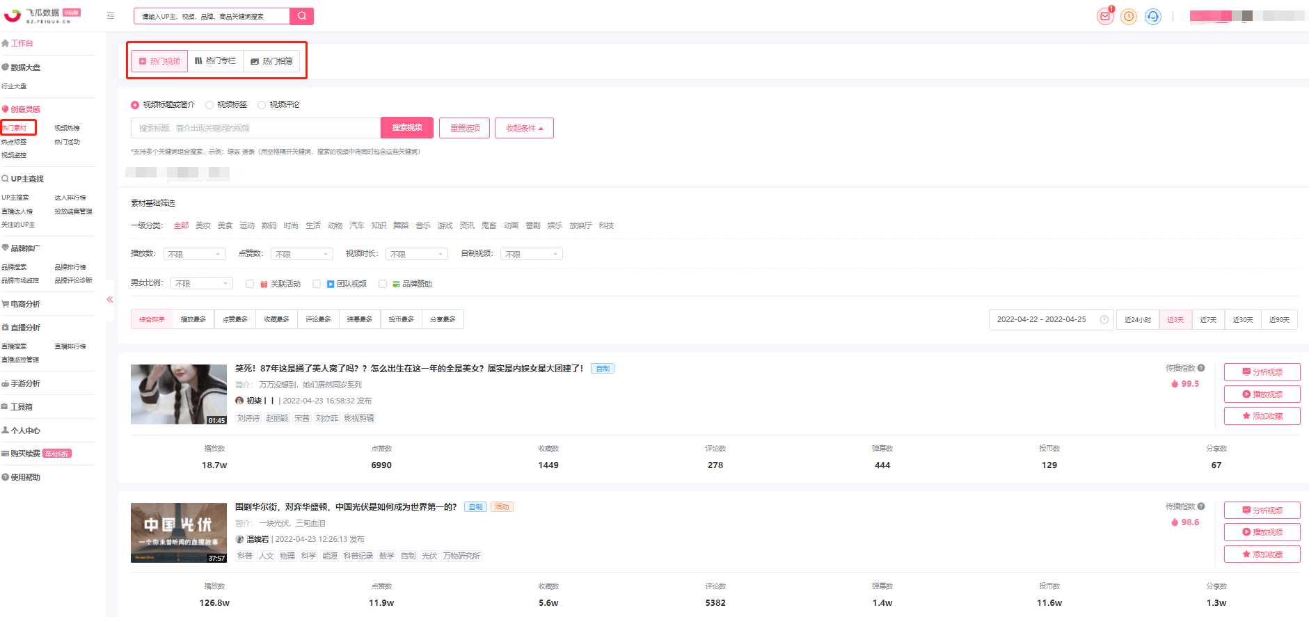 二、飞瓜数据B站版:进入飞瓜数据B站,点击热门素材查看热门视频