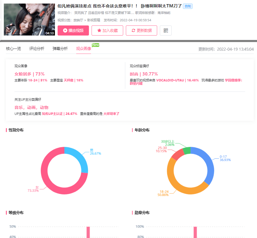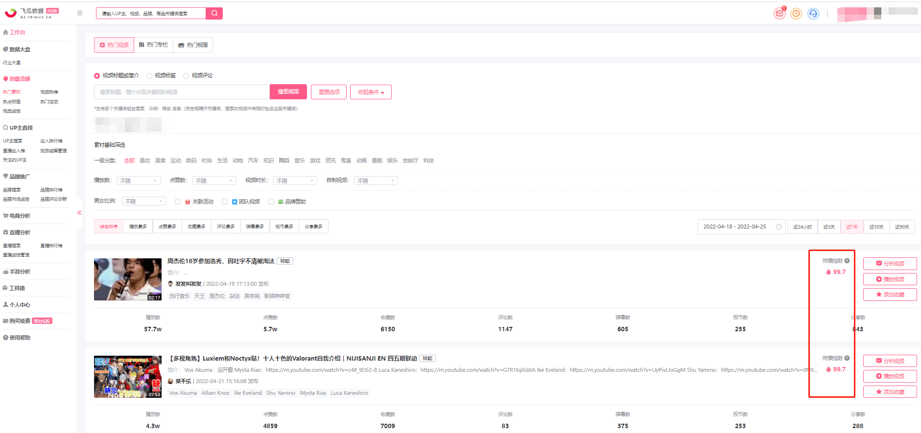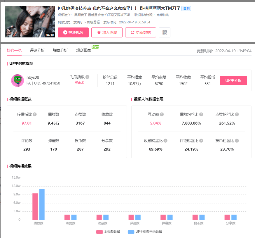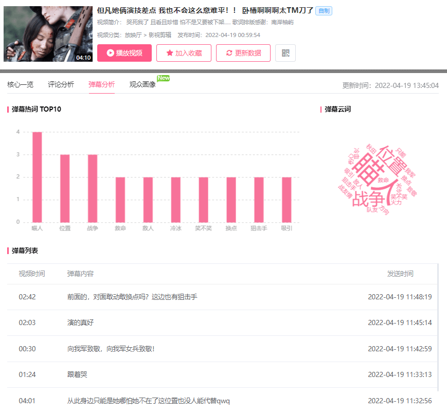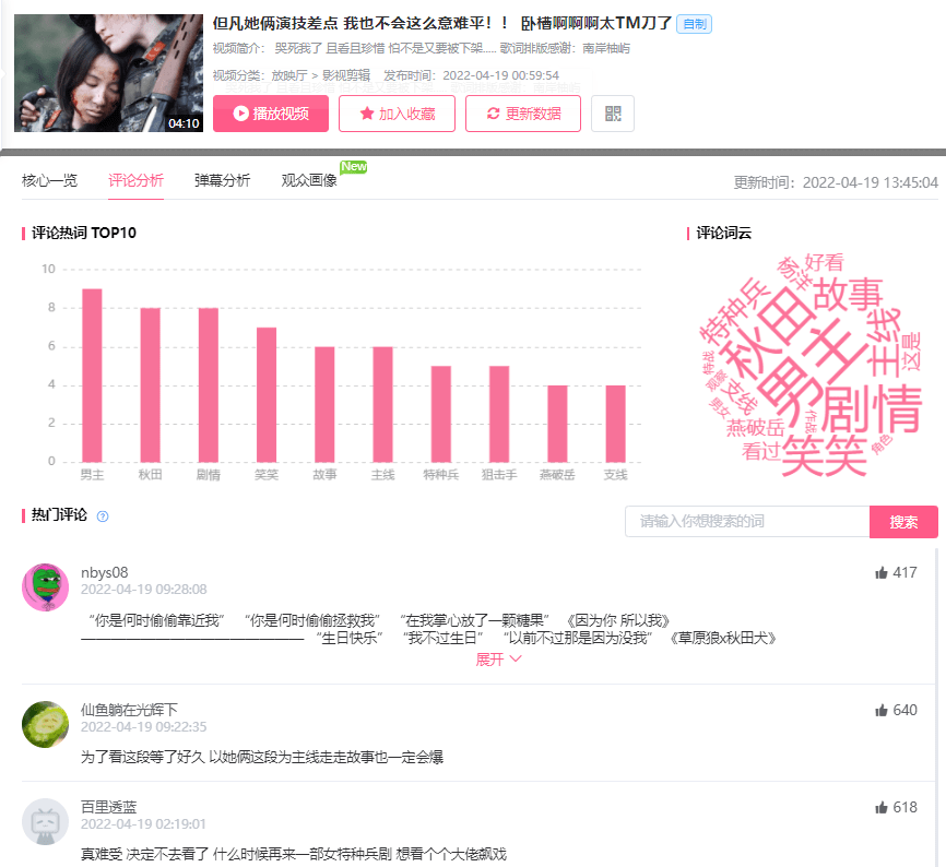 ②对传播指数较高的视频,可以进一步了解视频的更多内容,可以点击分析视频或播放视频来了解视频内容,点击“分析视频”按钮来查阅该视频的数据表现、评论分析、弹幕分析、观众画像。